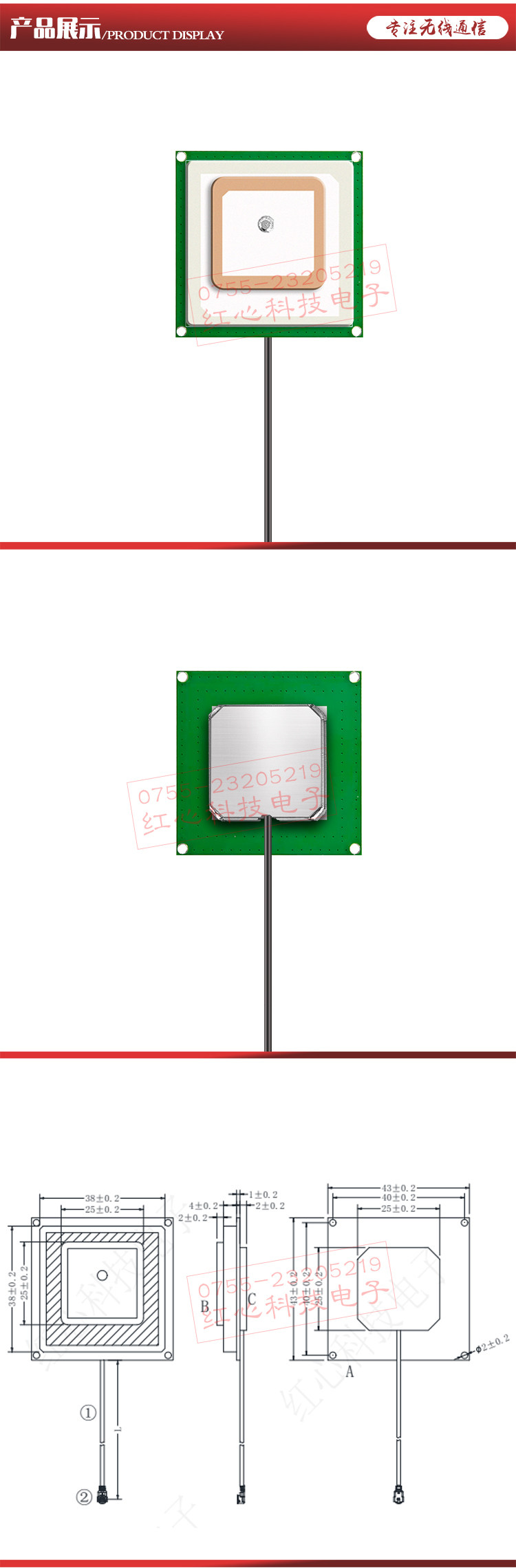 | 天线尺寸(Overal dimensions) | 25*25*2叠38*38*4 | mm |
